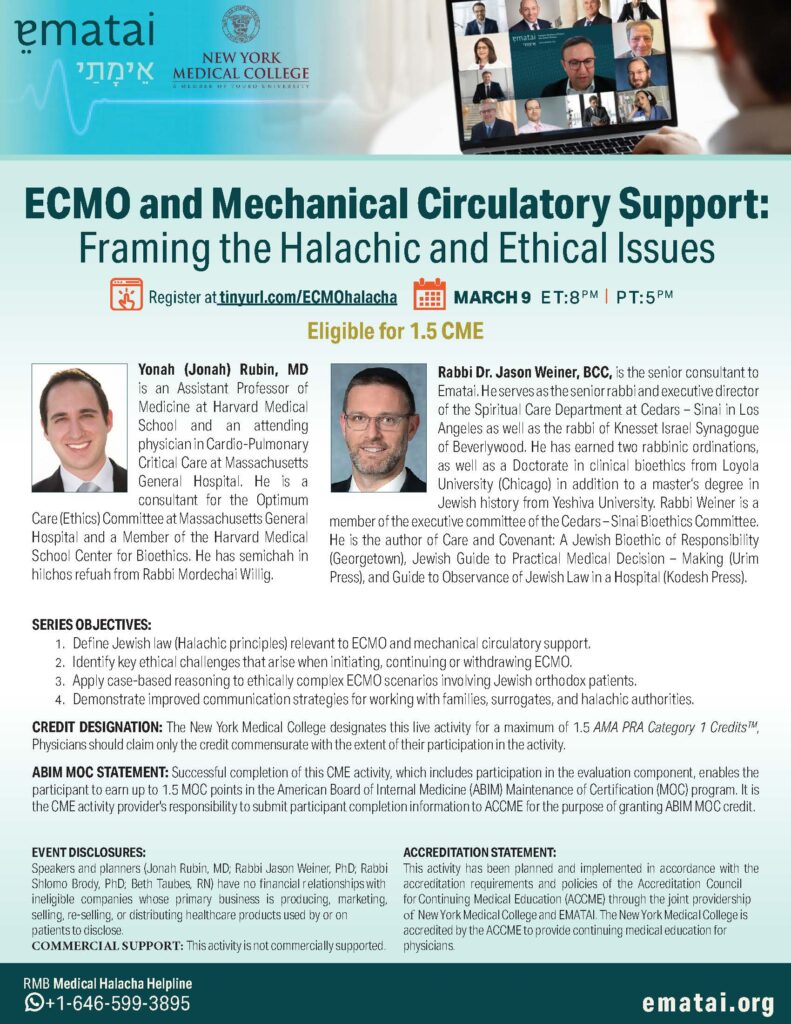 Join Ematai for an accredited 1.5 CME lecture on “ECMO and Mechanical Circulatory Support: Framing the Halachic and Ethical Issues” with Rabbi Dr. Jason Weiner and Dr. Yonah Rubin.